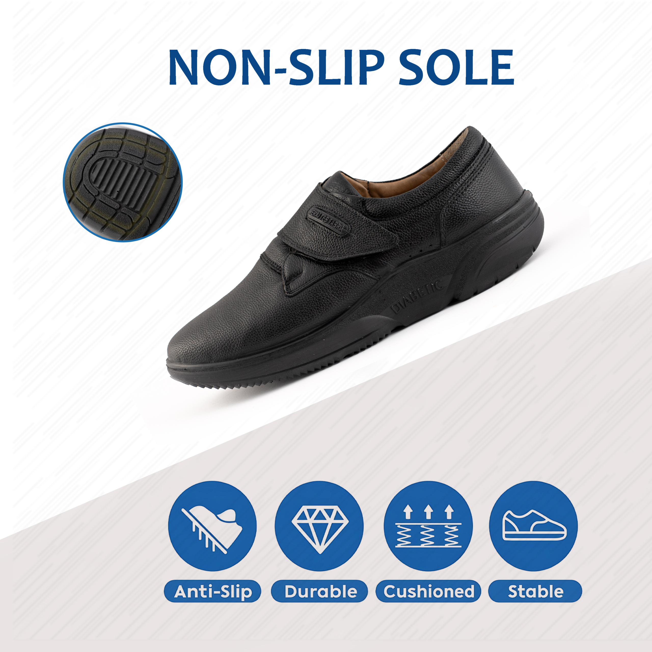 وجود بند قابل تنظیم (Adjustable Strap) امکان تطبیق کامل کفش با فرم پا را فراهم میسازد. این ویژگی برای بیماران دیابتی که دچار تورم پا در طول روز میشوند، بسیار ضروری است و از ایجاد فشار ناخواسته جلوگیری میکند.