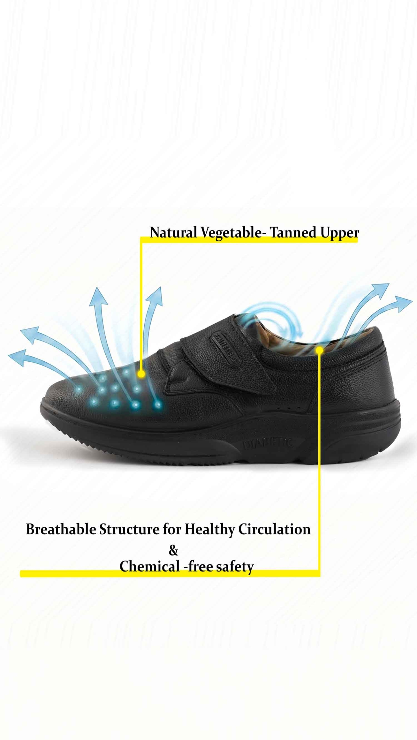 رویه کفش از مواد باکیفیت و قابل تنفس تولید شده تا از تعریق بیش از حد، افزایش رطوبت و رشد باکتری جلوگیری شود؛ عاملی مهم در پیشگیری از عفونتهای پوستی پا در بیماران دیابتی.